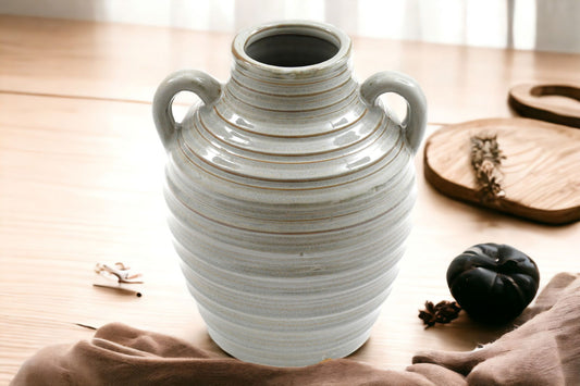 27cm Ceramic Grey Ribbed Vase with Handle Stylish Home Decor