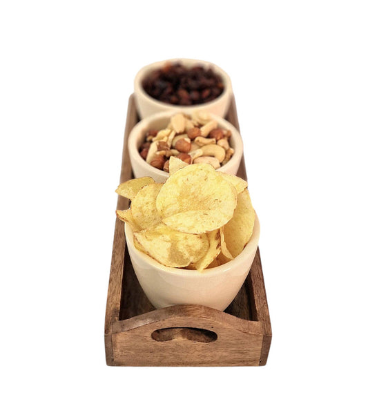 3 Ceramic Snack Bowls with Mango Wood Tray for Nibbles & Appetizers