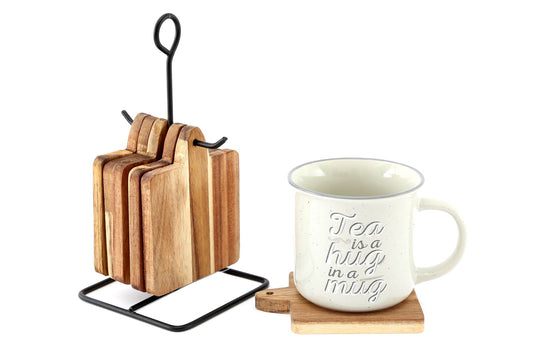 Set of 6 Acacia Coasters with Black Metal Stand - Stylish Home Decor