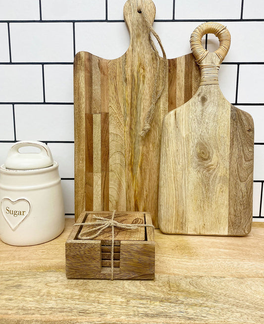 Set of 6 Mango Wood Coasters with Metal Stand for Home Decor