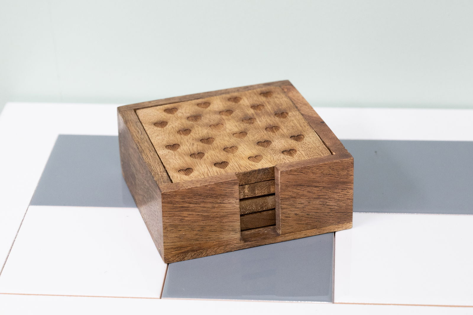 Discover our set of four square wooden coasters, beautifully crafted with heart imprints, perfect for adding a touch of charm to your home decor. Each coaster measures 10x10x1cm and is designed to fit snugly within a stylish wooden cradle that is just 1cm wide. The overall dimensions of the set are D5 x H12 x W12cm, making it a compact and elegant addition to any table setting. SKU: KG2004. These coasters not only protect your surfaces but also serve as a delightful conversation starter, making them an ideal gift for loved ones or a lovely treat for yourself!