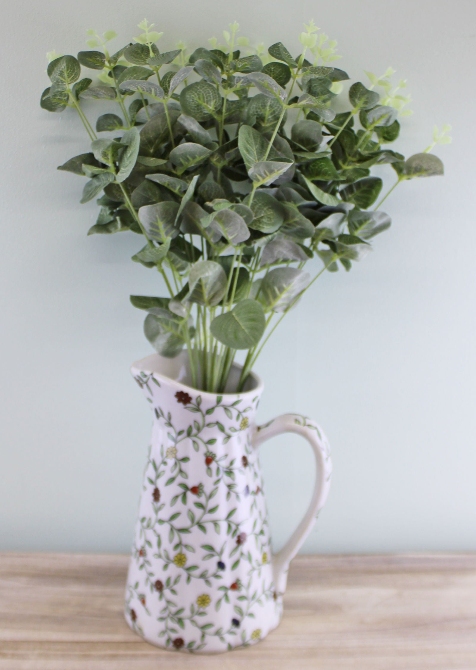 Enhance your decor with our artificial eucalyptus spray, featuring a realistic design in a light green color. Crafted from durable polyester leaves and sturdy plastic stems, this versatile piece measures 10 x 45 x 30 cm, making it perfect for any arrangement. SKU: FL1072. Ideal for adding a touch of nature to your home or office without the maintenance of real plants.