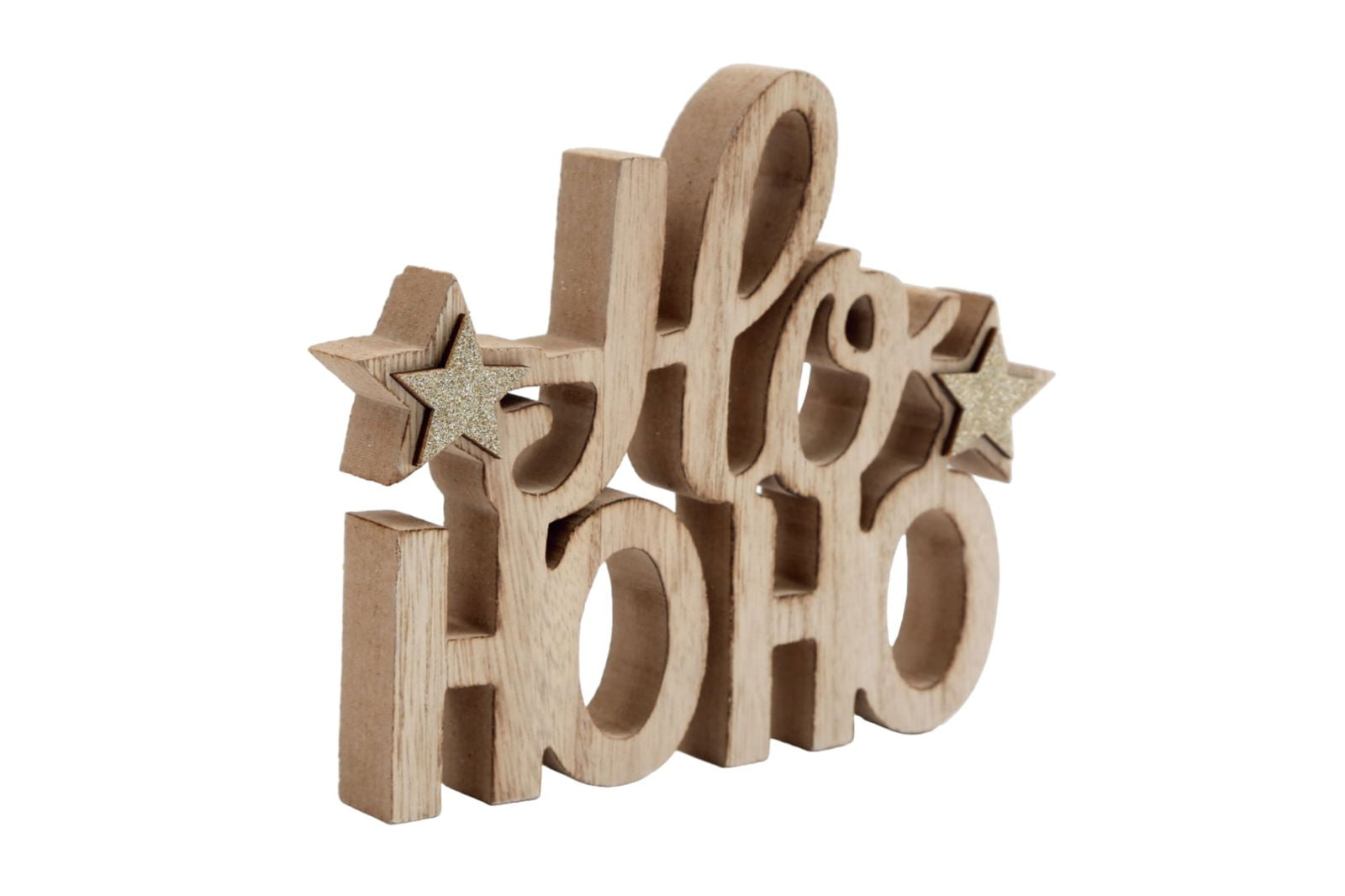 Enhance your holiday decor with our Wooden Cut Out 'Ho Ho Ho' Free-Standing Decoration. This charming piece features two gold glitter wooden stars, adding a touch of sparkle to your festive setup. With measurements of D2 x H15 x W18cm, it's the perfect size to display on mantels, tables, or shelves. Bring joy and warmth to your home this season with this delightful decoration that captures the spirit of Christmas!