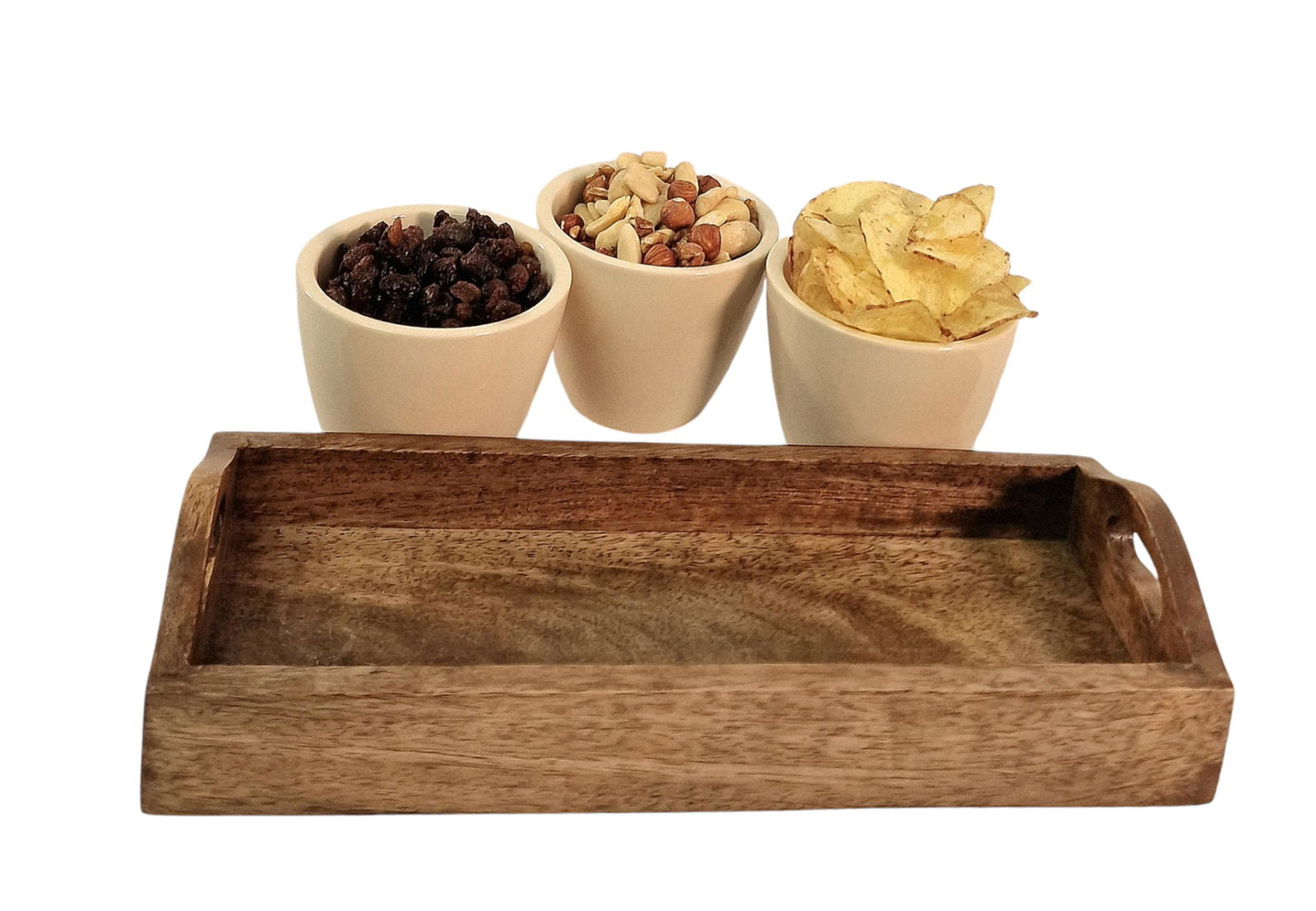3 Ceramic Snack Bowls with Mango Wood Tray for Nibbles & Appetizers
