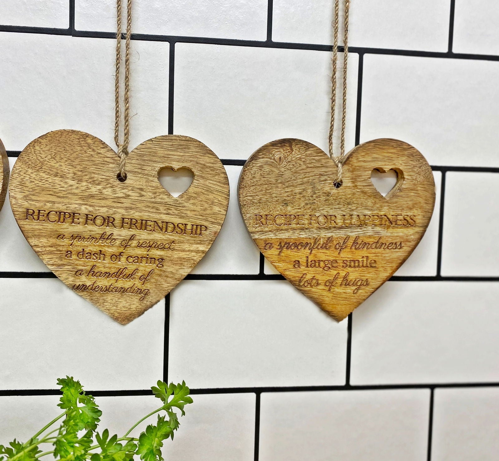 Enhance your home decor with our charming set of 4 wooden hanging plaques, each beautifully etched with inspiring words: 'Recipes for Love,' 'Friendship,' 'Happiness,' and 'Life.' These plaques feature a heart cut-out design and come with a jute loop for easy hanging, making them perfect for any room. Measuring D5 x H13 x W14cm, they are not only a delightful gift but also a stylish addition to your home. Elevate your space with these meaningful plaques that celebrate the essence of life and relationships.