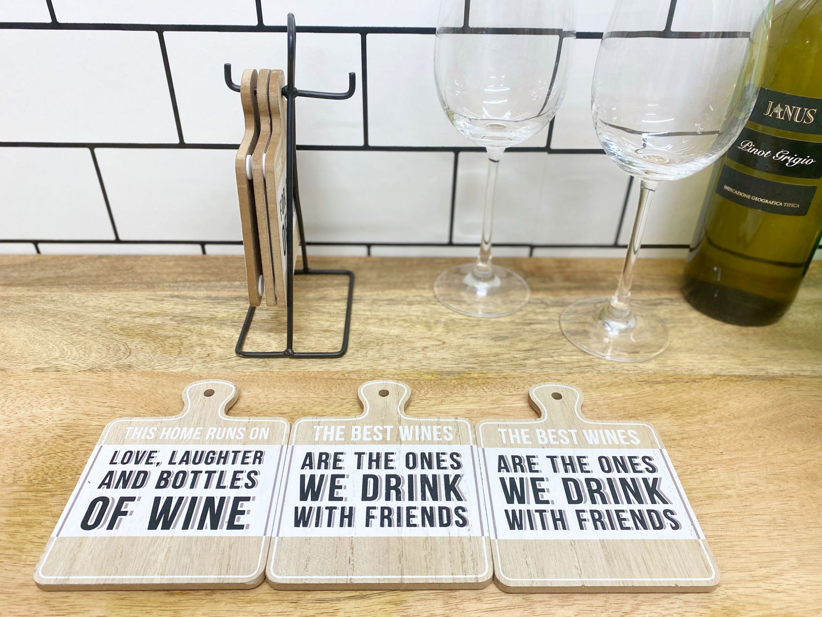 Introducing our set of 6 wood effect coasters, designed with a charming wine slogan that adds a touch of elegance to your home decor. These coasters come with a convenient metal base for easy storage when not in use, ensuring your space remains tidy. Each coaster measures approximately 10cm x 13cm, making them the perfect size for your favorite drinks. Crafted from durable MDF, they are built to last, while the black printed slogan adds a stylish flair. With measurements of D7 x H19 x W10.5cm, this coaster set is not only functional but also a beautiful addition to your dining experience. Elevate your entertaining with these delightful coasters that protect your surfaces while showcasing your love for wine!