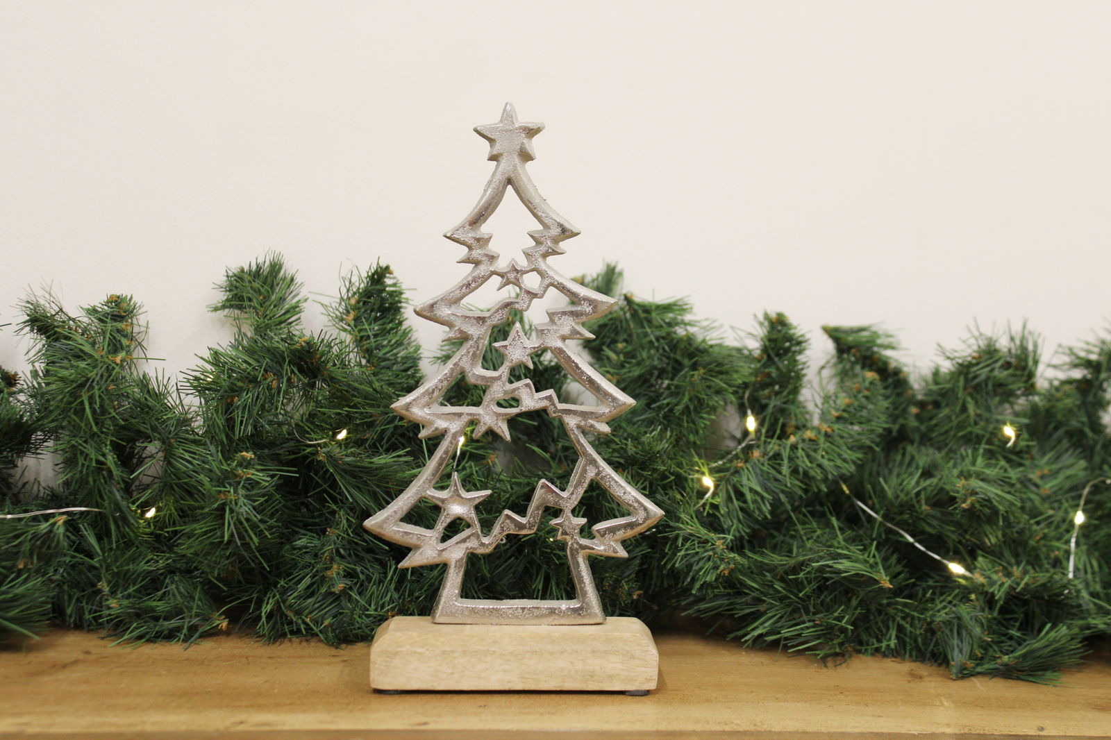 Enhance your Christmas displays with our contemporary silver Christmas tree decoration. This striking design, fixed upon a sturdy wooden plinth, adds a modern touch to your holiday decor. With measurements of D5 x H16 x W26cm, it fits perfectly on mantels, tabletops, or as a centerpiece. Elevate your festive atmosphere and impress your guests with this unique and stylish ornament.