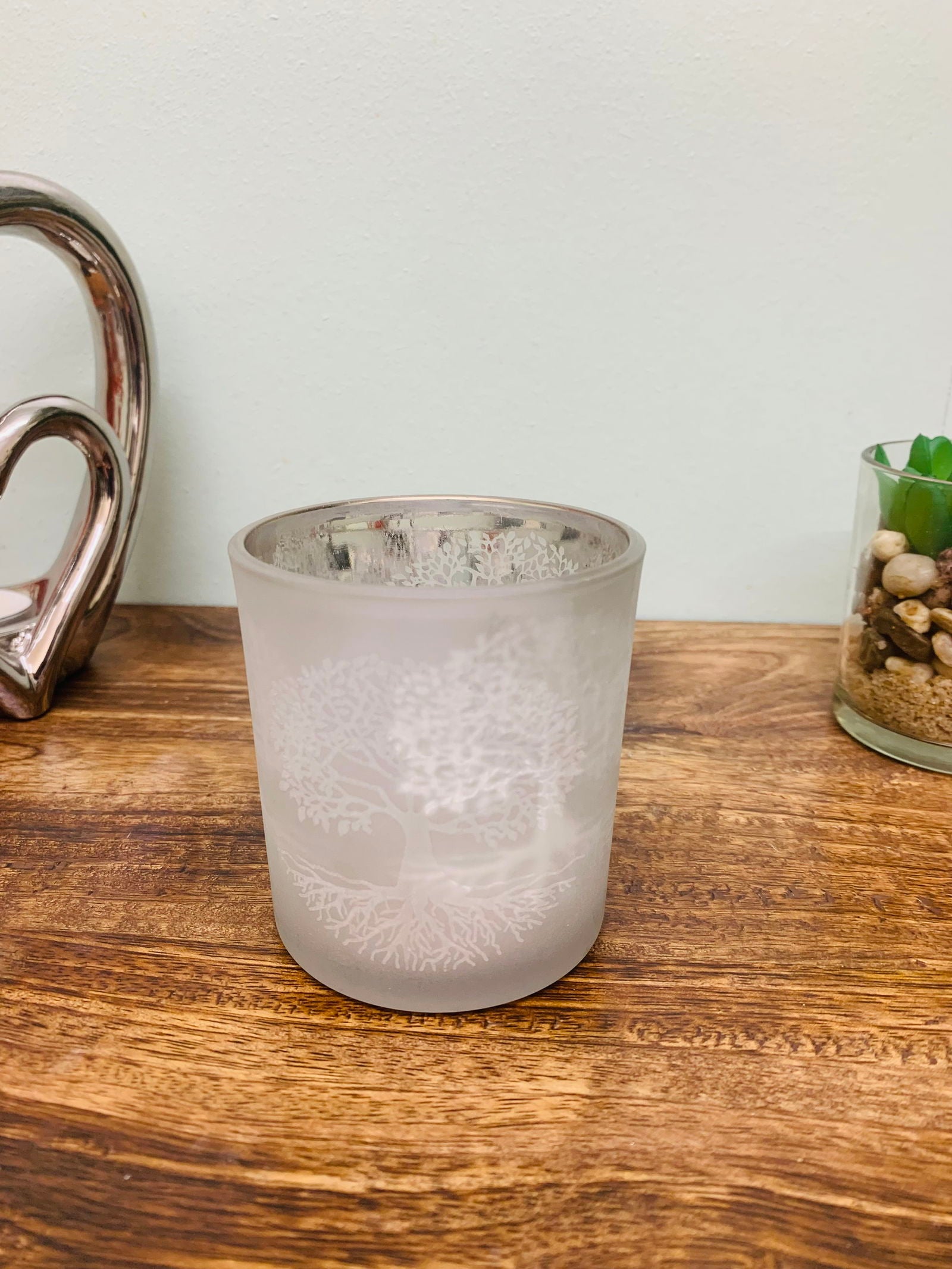 Illuminate your home with our stunning Tree of Life Frosted Tealight Holder. This beautifully designed glass tealight jar features a frosted exterior and a mirrored interior, showcasing a delicate ghosted tree of life motif. Perfect for any room, it adds a warm and inviting ambiance to your space.