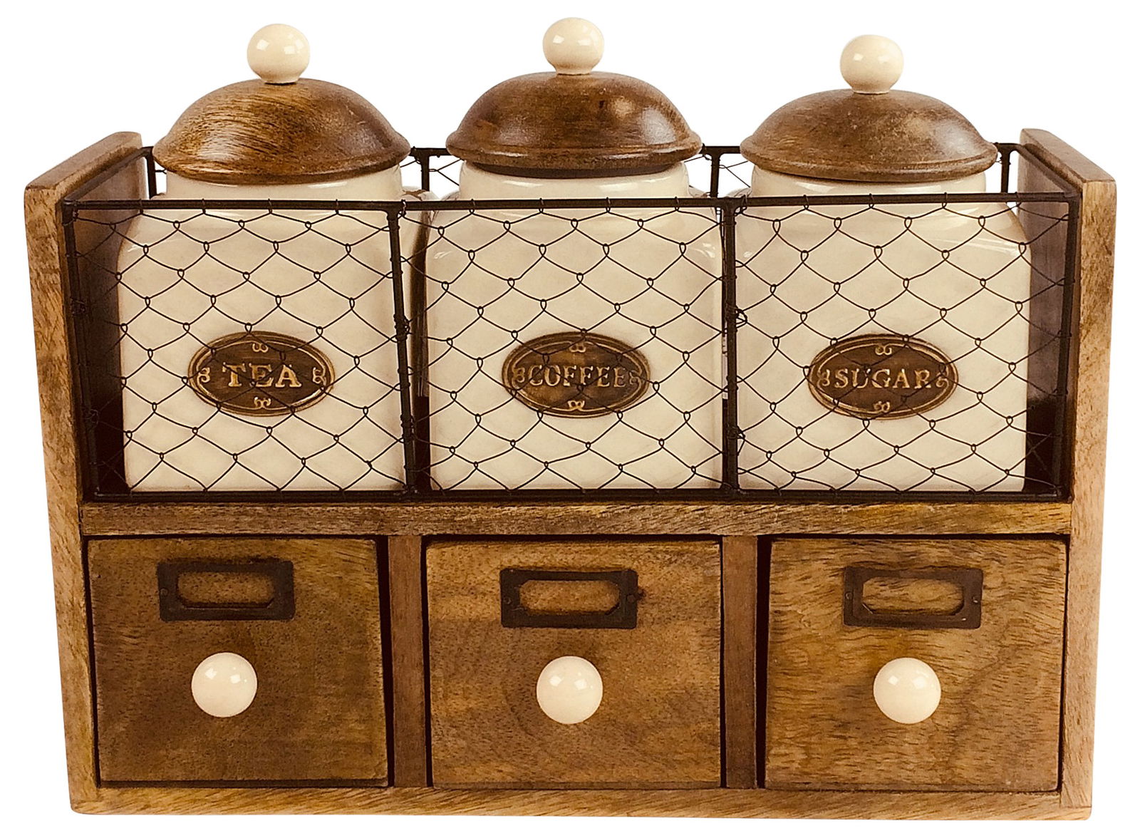 Introducing our versatile Wooden and Metal Rack, designed to enhance your kitchen or living space while providing practical storage solutions. This stylish rack features three spacious drawers, perfect for organizing your essentials, and comes with three elegant ceramic jars labeled TEA, COFFEE, and SUGAR, adding a touch of charm to your decor.