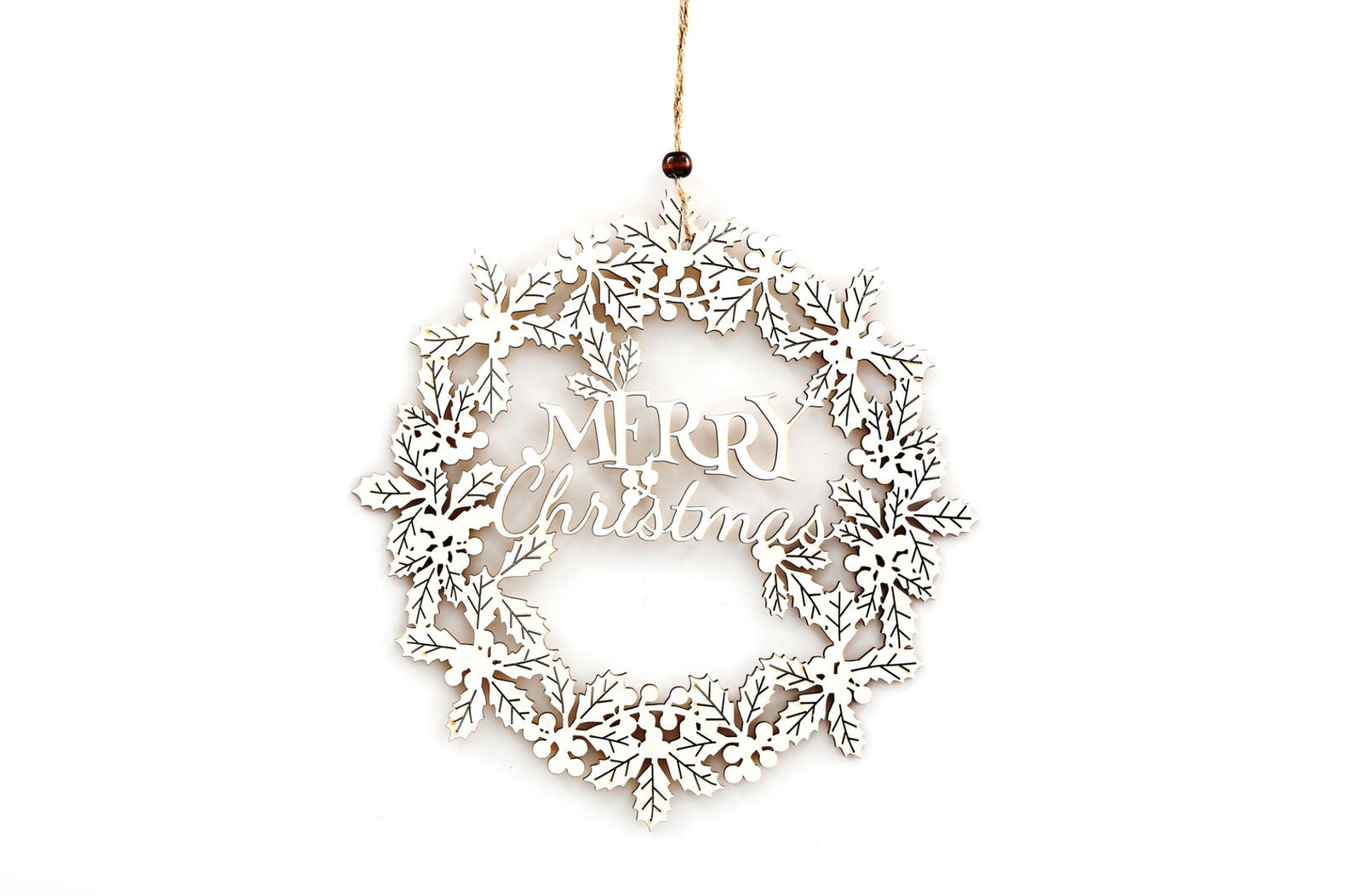 Enhance your holiday decor with this charming hanging decoration, crafted from painted white wood. Featuring cut-out wording that reads 'Merry Christmas', this piece adds a festive touch to any space. Adorned with a delicate white holly leaf and berry decal, it brings a natural elegance to your home. Complete with a sturdy hanging natural rope, this decoration is easy to display. Measurements: Diameter 1 cm x Height 23 cm x Width 23 cm. Perfect for creating a warm and inviting atmosphere during the holiday season!